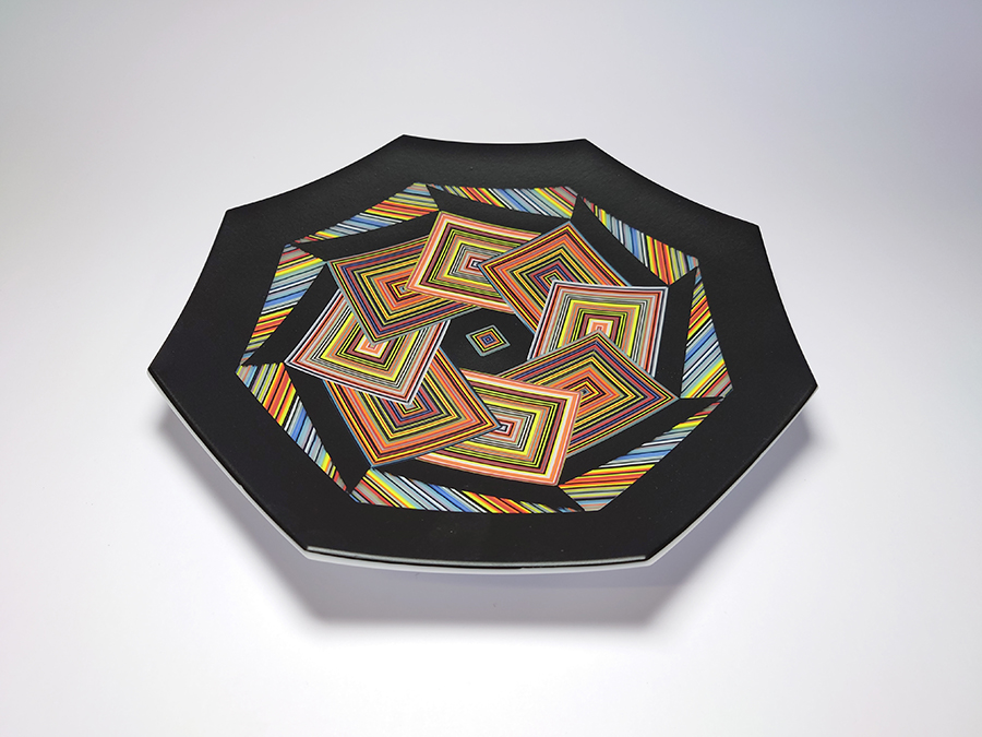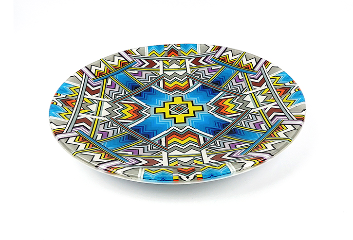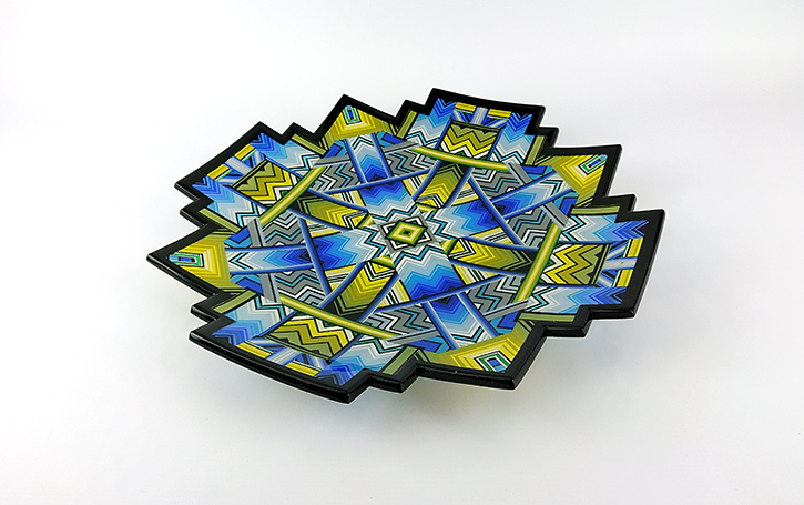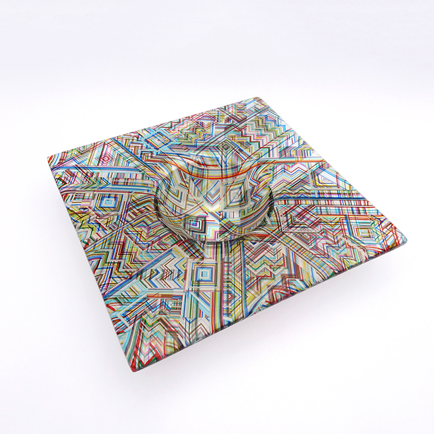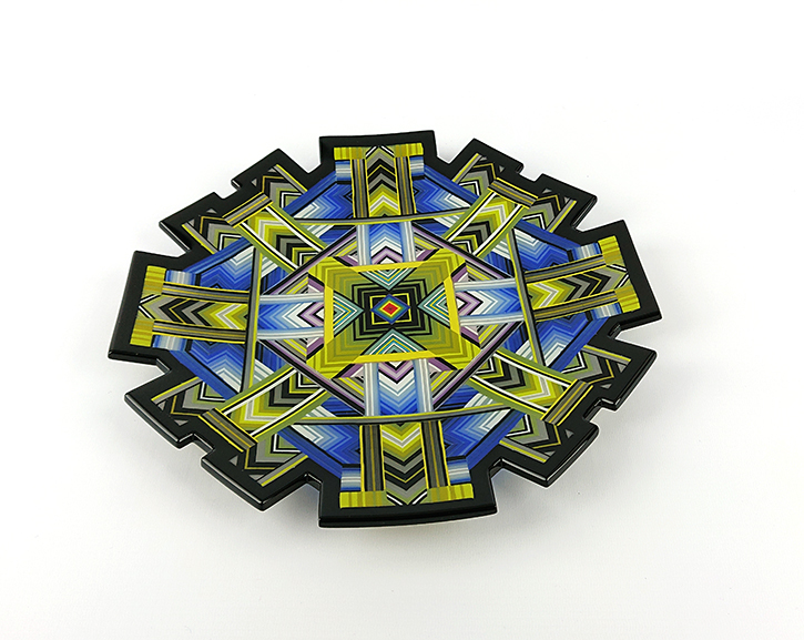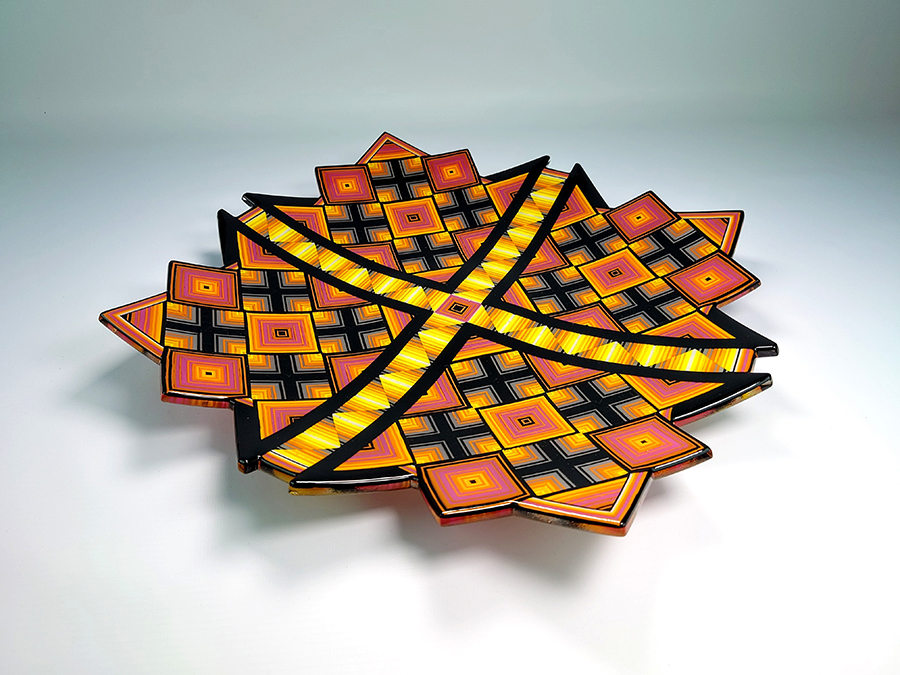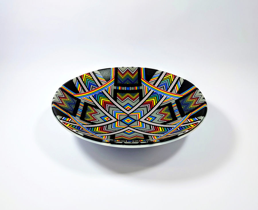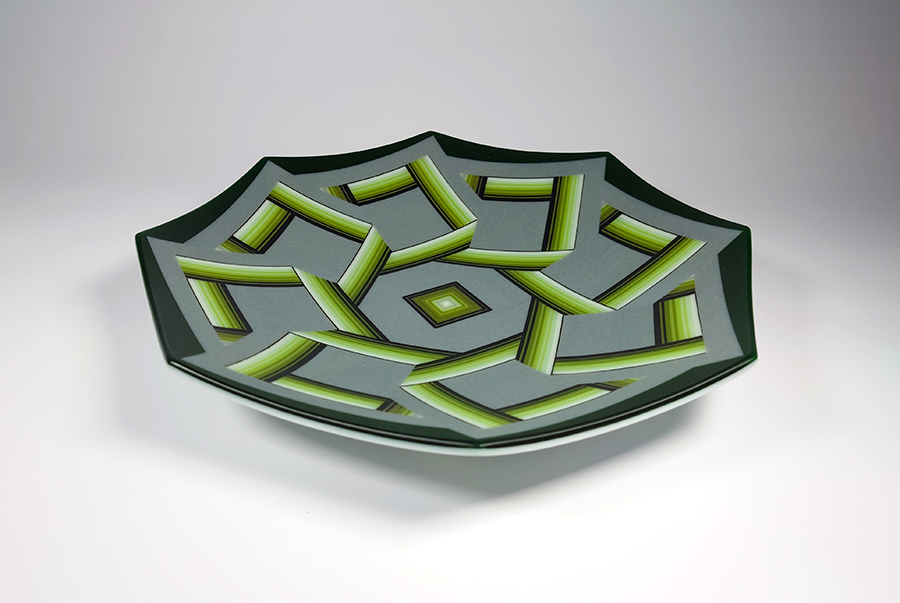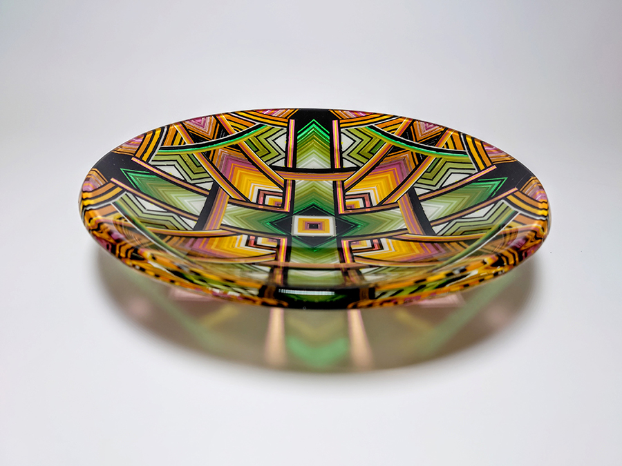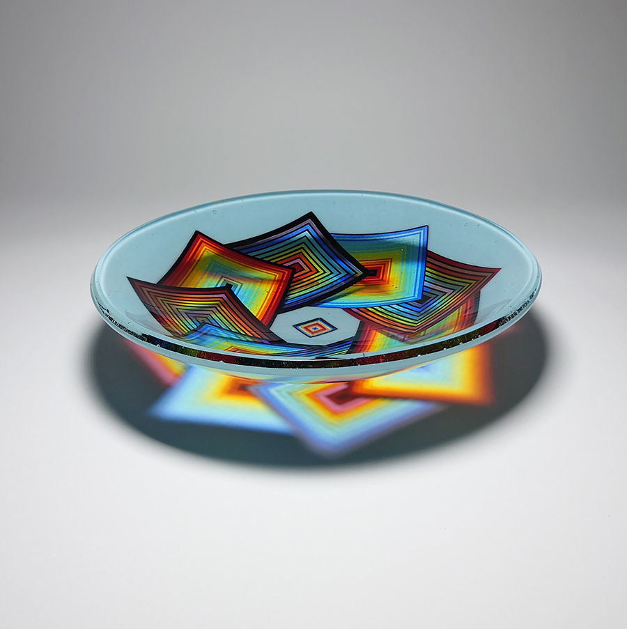 Ian produces a wide variety of kiln-formed glass bowls. The process of forming the glass bowls requires many stages. Initially the patterns within the glass are formed by kiln-forming a sheet of striped, coloured glass which is then deconstructed and cut into smaller elements which are accurately arranged to form the pattern. This sheet of patterned glass is then melted into a solid sheet of glass within the kiln. Once this sheet of glass is carefully cooled(annealed) then it is removed from the kiln whereupon it is cold-worked using diamond abrasives to achieve the desired shape and surface finish. The piece is then returned to the kiln for a controlled, lower temperature firing which returns a shine to the surface of the glass without losing its form. Once this has cooled(annealed) and is removed from the kiln Ian then has to choose the type of shape he wants the patterned piece of glass to become. To achieve the shaping of the sheet of patterned glass it is again placed within the kiln whereupon the heat from the kiln softens the glass enough to allow the weight of the glass and gravity to form the glass into its desired shape. The shape is determined using a ceramic former which can be custom made for each size and shape of bowl to be formed. Once the piece of glass has draped with heat and gravity into its desired shape it is again annealed before cooling and removing from the kiln. Each firing within the kiln takes an average of 16 hours and each glass bowl involves a minimum of four separate firings.