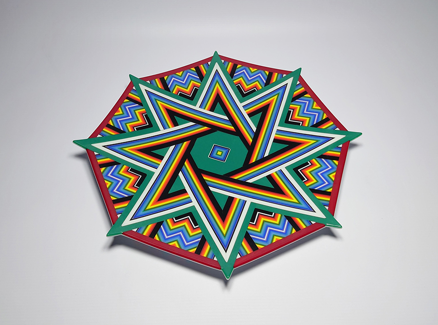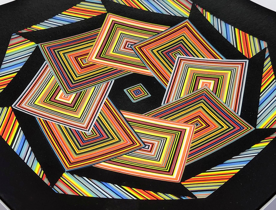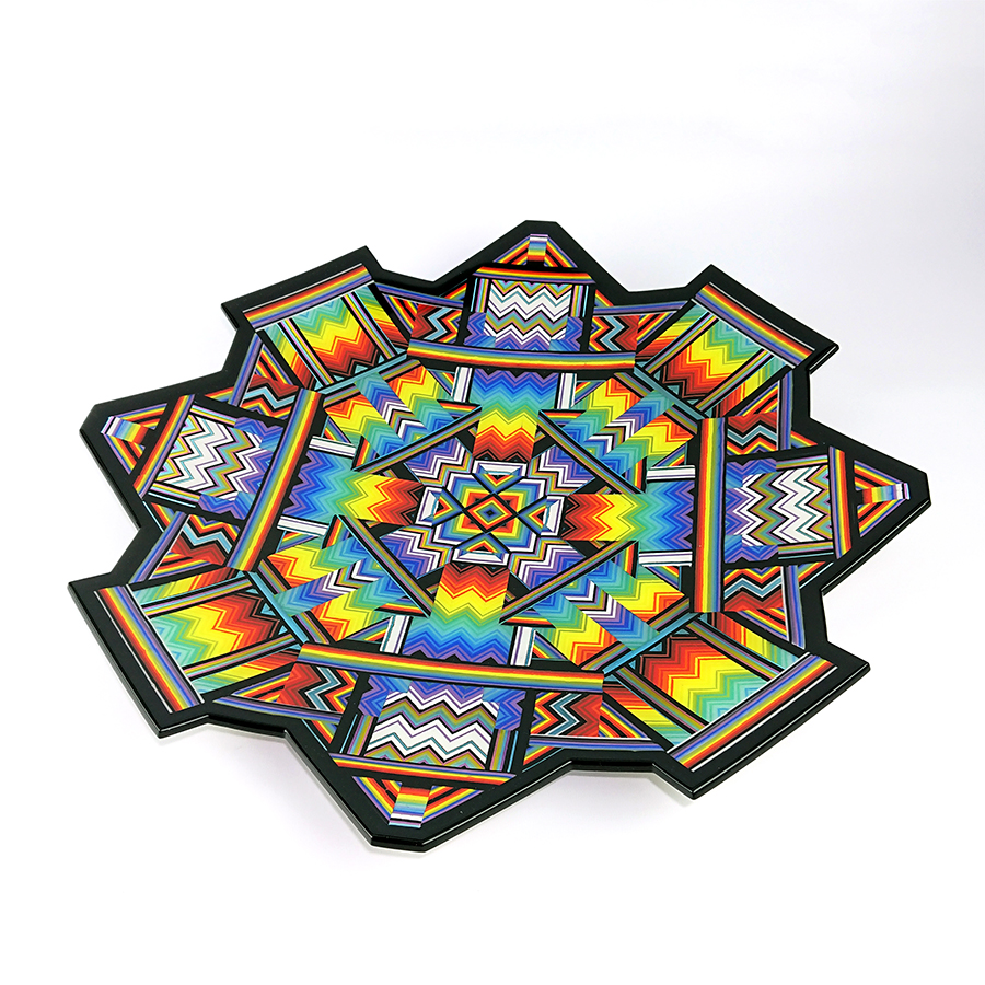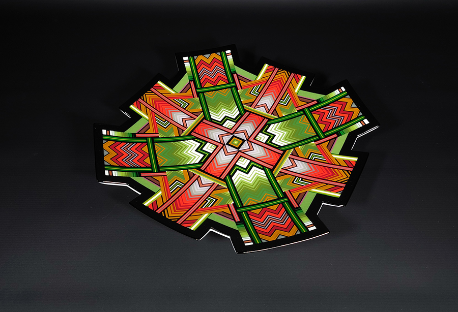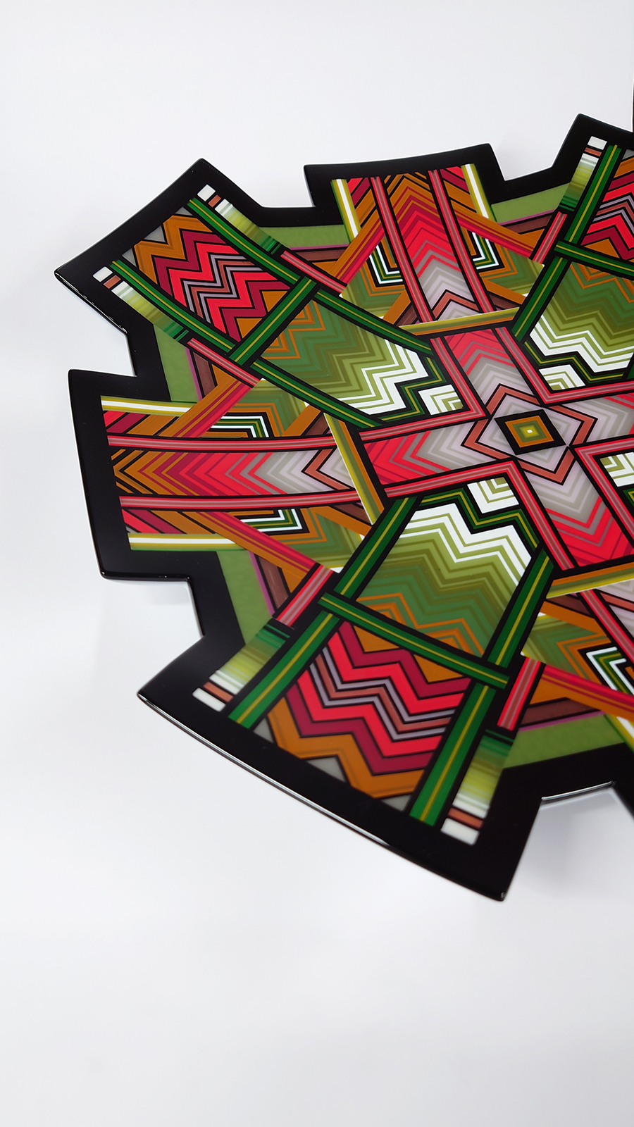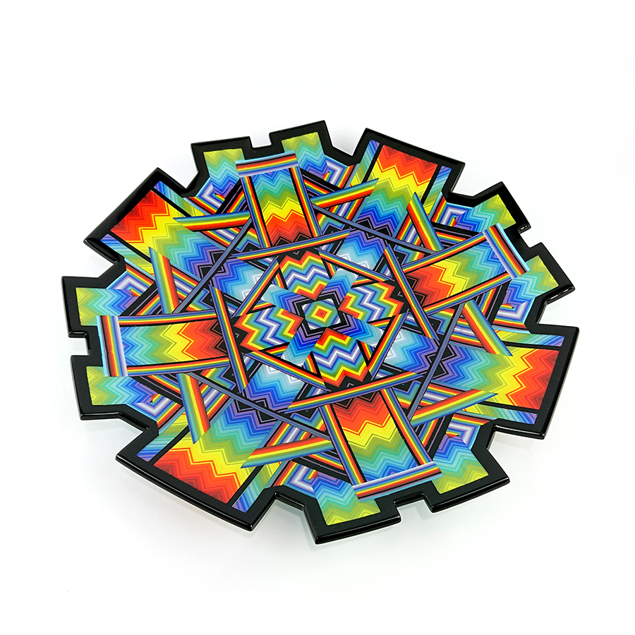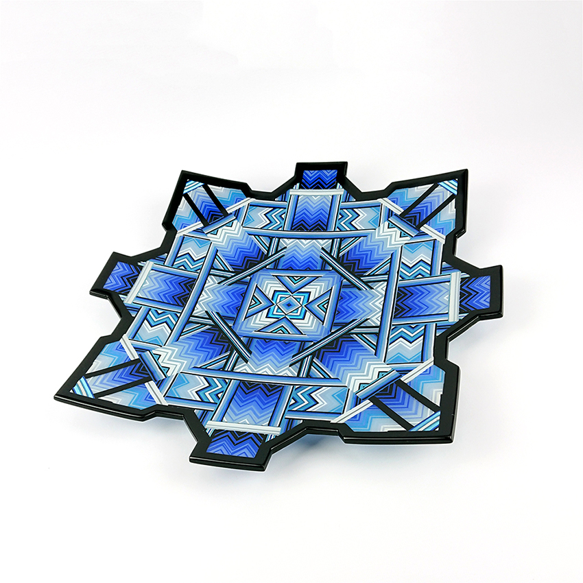 Ian produces a wide variety of kiln-formed glass bowls. The process of forming the glass bowls requires many stages. Initially the patterns within the glass are formed by kiln-forming a sheet of striped, coloured glass which is then deconstructed and cut into smaller elements which are accurately arranged to form the pattern. This sheet of patterned glass is then melted into a solid sheet of glass within the kiln. Once this sheet of glass is carefully cooled(annealed) then it is removed from the kiln whereupon it is cold-worked using diamond abrasives to achieve the desired shape and surface finish. The piece is then returned to the kiln for a controlled, lower temperature firing which returns a shine to the surface of the glass without losing its form. Once this has cooled(annealed) and is removed from the kiln Ian then has to choose the type of shape he wants the patterned piece of glass to become. To achieve the shaping of the sheet of patterned glass it is again placed within the kiln whereupon the heat from the kiln softens the glass enough to allow the weight of the glass and gravity to form the glass into its desired shape. The shape is determined using a ceramic former which can be custom made for each size and shape of bowl to be formed. Once the piece of glass has draped with heat and gravity into its desired shape it is again annealed before cooling and removing from the kiln. Each firing within the kiln takes an average of 16 hours and each glass bowl involves a minimum of four separate firings.